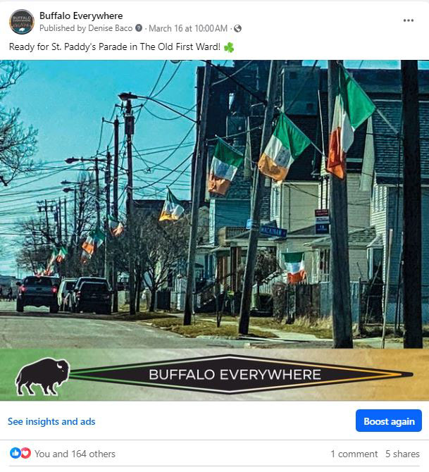 Buffalo Everywhere shifted from being solely an apparel brand to a Buffalo-based lifestyle brand, focusing on Buffalo-centric content familiar to Western New Yorkers. The goal was to create content that resonates with the local community by tapping into recognizable themes and references. Through social media, the brand fosters a sense of home, pride, comfort, nostalgia, fun, and community, while also promoting Buffalo Everywhere apparel.